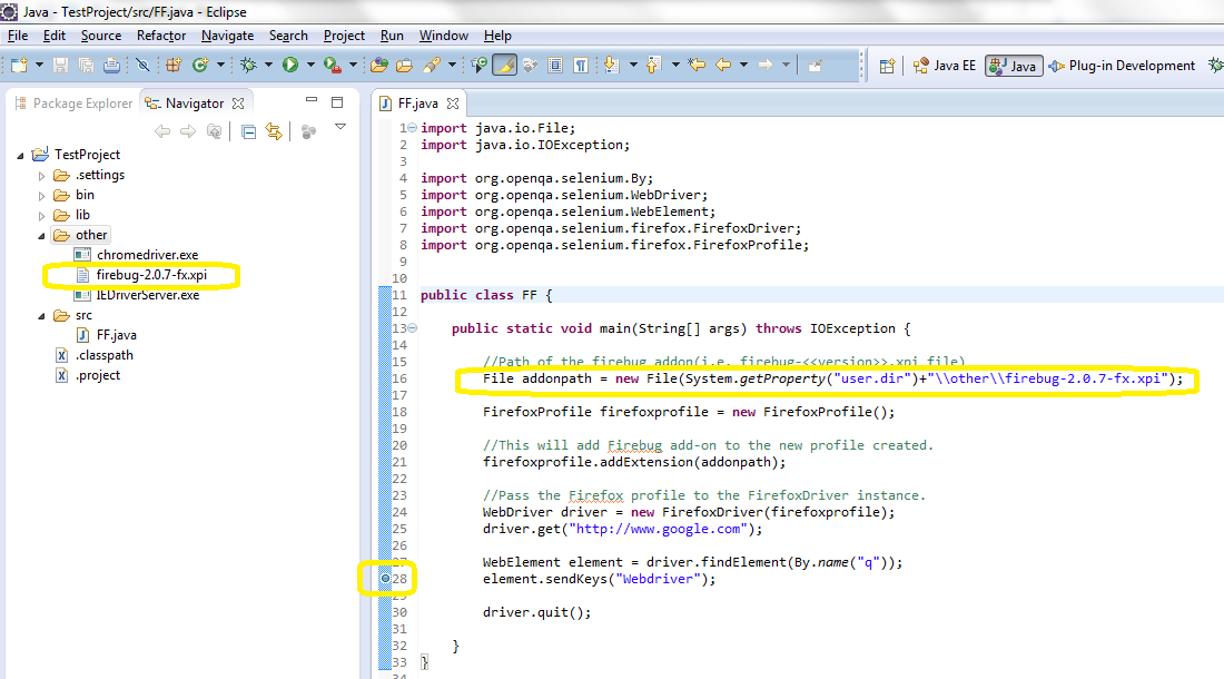 File addonpath = new File(System.getProperty("user.dir")+"\\other\\firebug-2.0.7-fx.xpi");